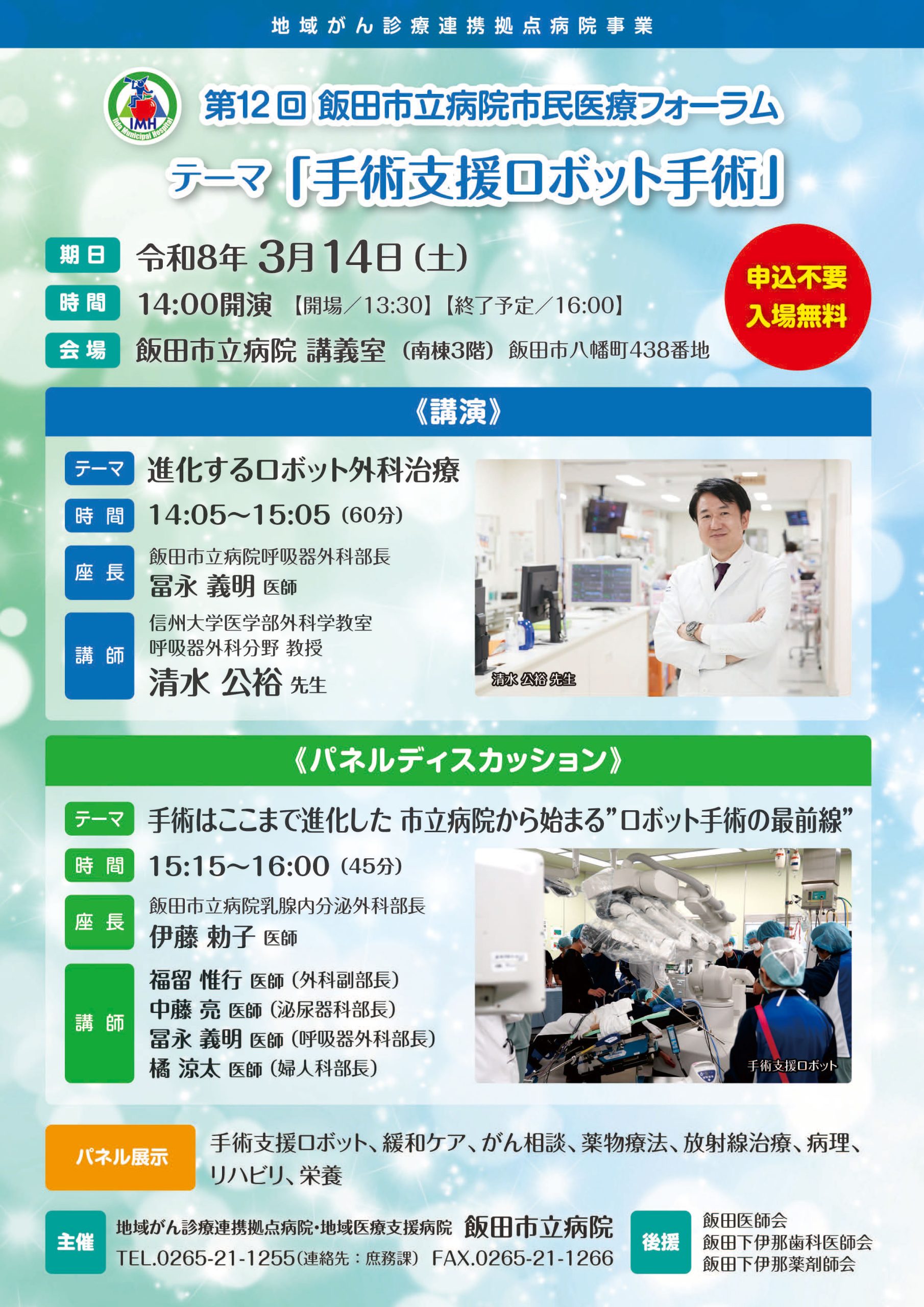 地域がん診療連携拠点病院である飯田市立病院では、がん診療に関する知識の普及啓発の取り組みとして、市民医療フォーラムを開催します。 今回は、手術支援ロボット手術について、講師を招いての講演、パネル展示等を行います。 申込不要で、どなたでも無料で参加いただけます。