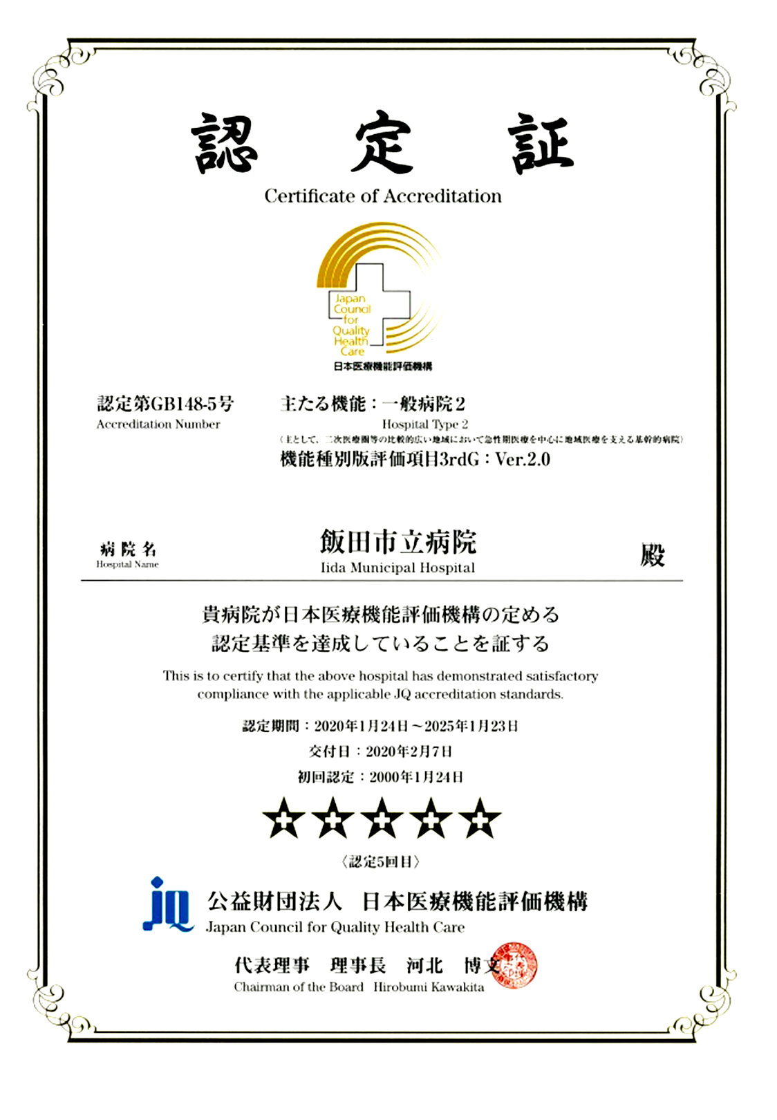 当院は2000年に公益財団法人日本医療機能評価機構の更新審査『3rdG:Ver2.0』を受審し、2020年2月7日付で認定証の交付を受けました。