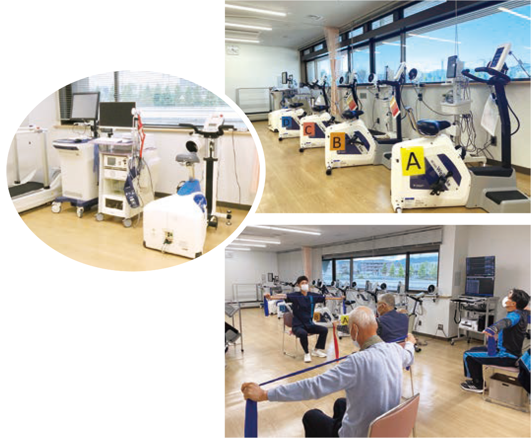 また、生活改善のアドバイス、精神的サポートや就労・社会復帰の相談に応じます。当院では、検査用のマスクをつけた状態で心電図や呼気ガス測定を行いながら自転車をこぐ運動を行う心肺運動負荷試験(CPX)を実施し、得られた心臓や肺、筋肉の機能を含めた全身の運動能力の結果を基に、一人ひとりより最適な運動負荷を設定し、効果的な運動プログラムを実施しています。