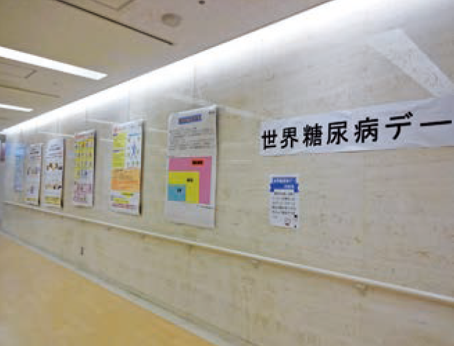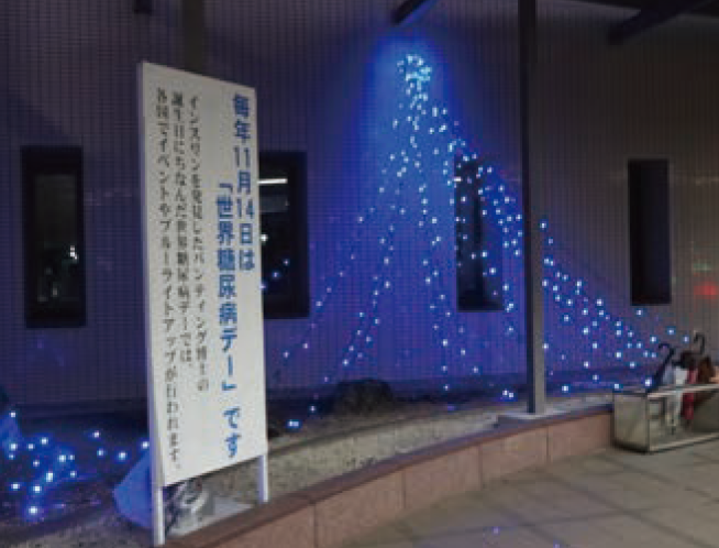 「全国糖尿病週間」中は、糖尿病の正しい理解を促進し、患者さんが不利益を被ることのない社会の形成を目的として、各地で様々な啓発活動が行われます。飯田市立病院においても、正面玄関をテーマカラーである青色にライトアップし、ロビーにおいて糖尿病に関するポスター展示を行います。